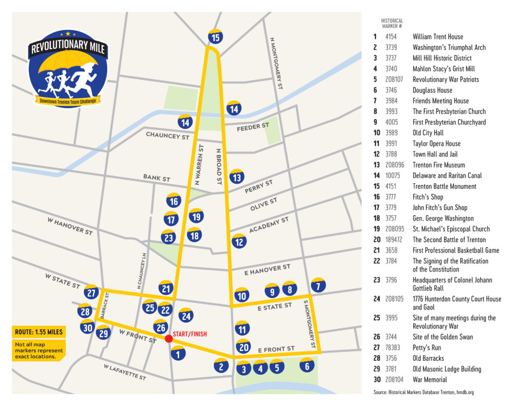 - A route that weaves through downtown Trenton’s historic core, with yellow umbrella markers highlighting heritage sites